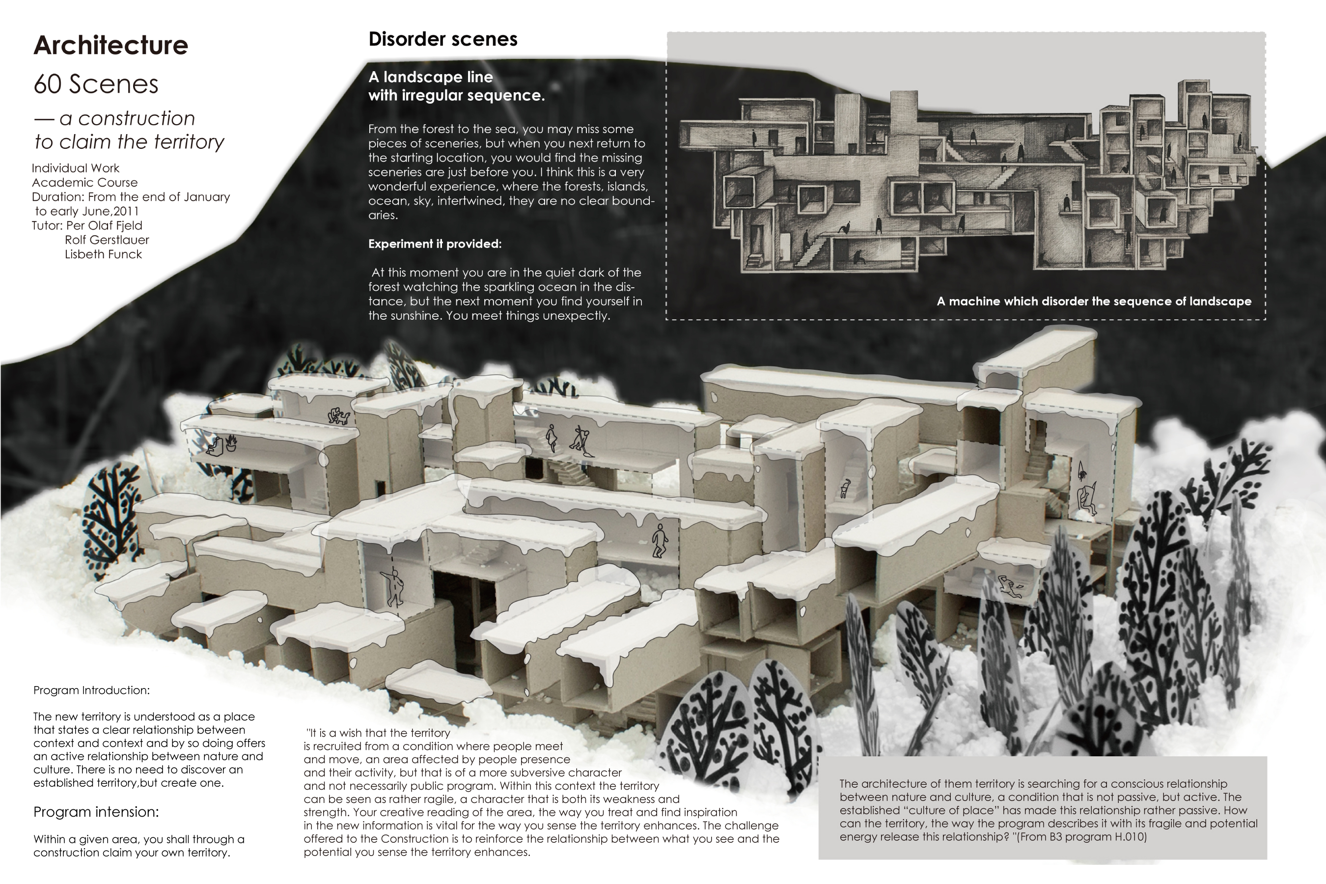 The new territory is understood as a place that states a clear relationship between context and context and by so doing offers an active relationship between nature and culture. There is no need to discover an established territory,but create one. Within a given area, you shall through a construction claim your own territory.