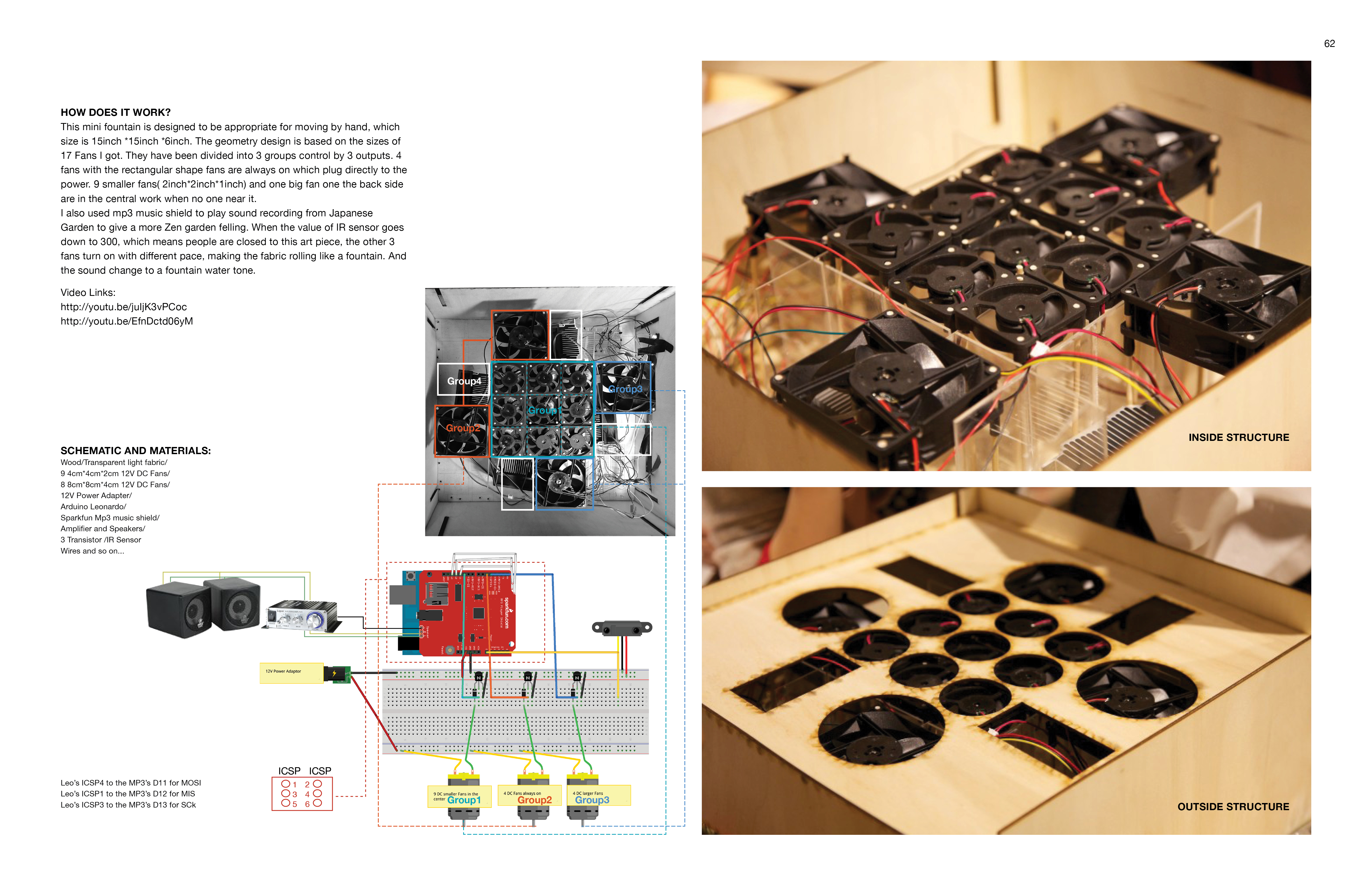 The idea begins from creating a tiny dry fountain with wind, interacting with people’s movement. I image it as a movable, digital, internal fountain, and I am curious how much it has to change the character of a space or to construct a space. It is inspired by Japanese dry landscape gardens, which contain their national scenes in a tiny space. The space is limited, but your mind can go far away without any boundaries.