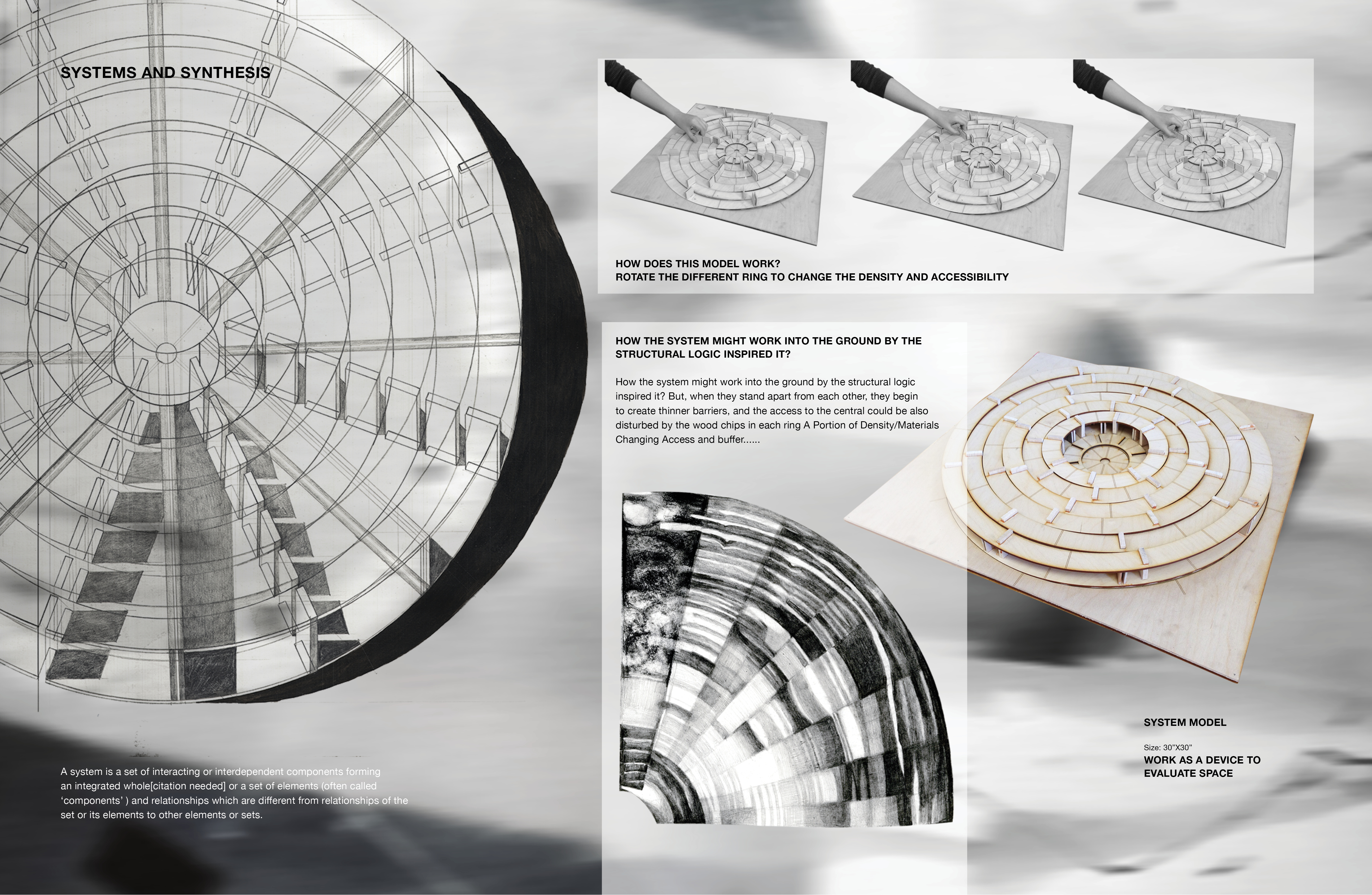 How the system might work into the ground by the structural logic inspired it? But, when they stand apart from each other, they begin to create thinner barriers, and the access to the central could be also disturbed by the wood chips in each ring A Portion of Density/Materials Changing Access and buffer……