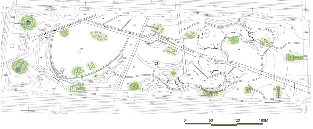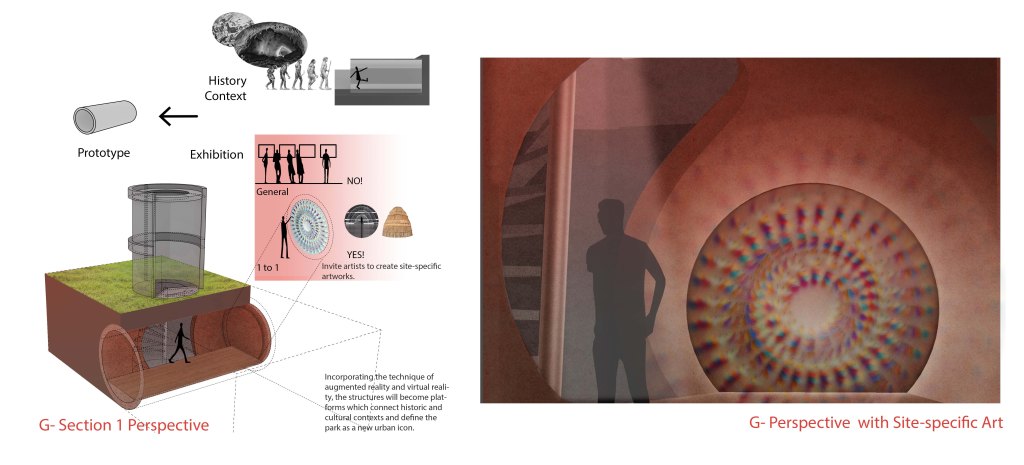The selected site, Art Park, is at the center of Shanshui Green Corridor, which is located on the axis between the Luoma Lake and the NaTian Flower Farm in Suqian. This is a great location for visitors to experience the past and future of the city within the urban park setting. Suqian is a dynamic historical city. Xiacaowan Fossil Anthropoid Relic Site is located at the south of the city. According the academic report, Xiacaowan man belongs to later period Homo sapiens, who is almost the same with modern man. Experts believe the Xiacaowan men are descendants of Beijing Ape Man and are also ancestors of modern Chinese. Using the concept of human evolution and Chinese philosophy, Scenic Orifice investigates history, culture, and functions. It reinterprets the urban landscape and creates a user-centric design which is adaptive and sustainable.