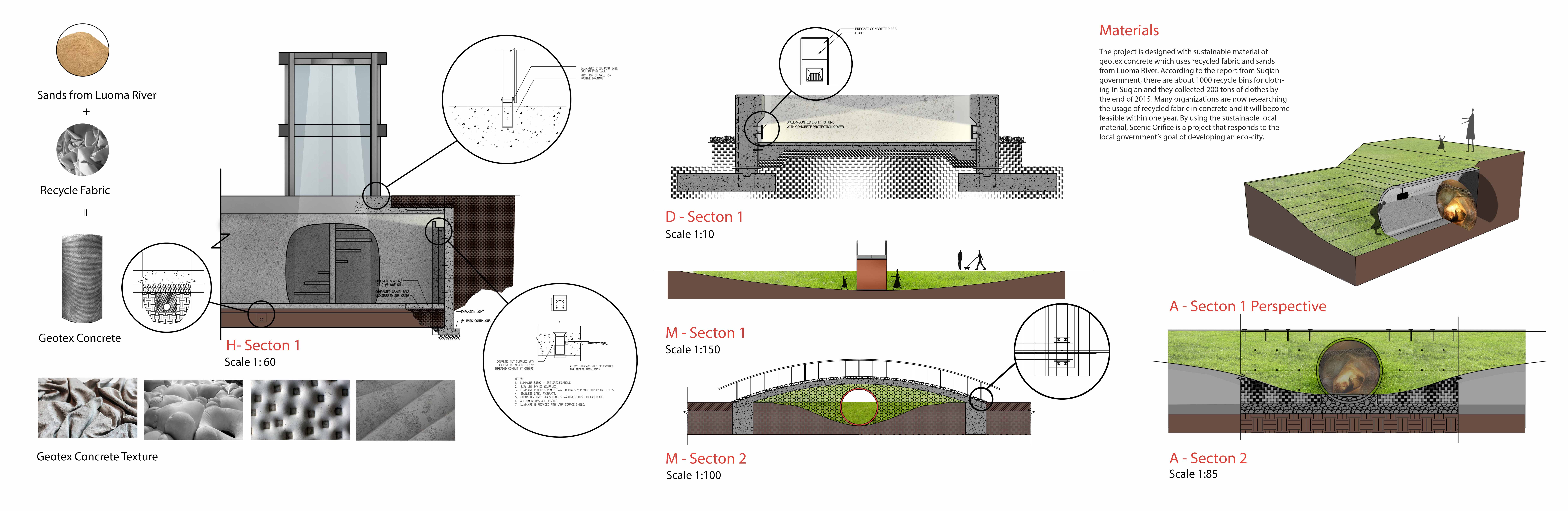 The project is designed with sustainable material of geotex concrete which uses recycled fabric and sands from Luoma River. According to the report from Suqian government, there are about 1000 recycle bins for clothing in Suqian and they collected 200 tons of clothes by the end of 2015. Many organizations are now researching the usage of recycled fabric in concrete and it will become feasible within one year. By using the sustainable local material, Scenic Orifice is a project that responds to the local government’s goal of developing an eco-city.