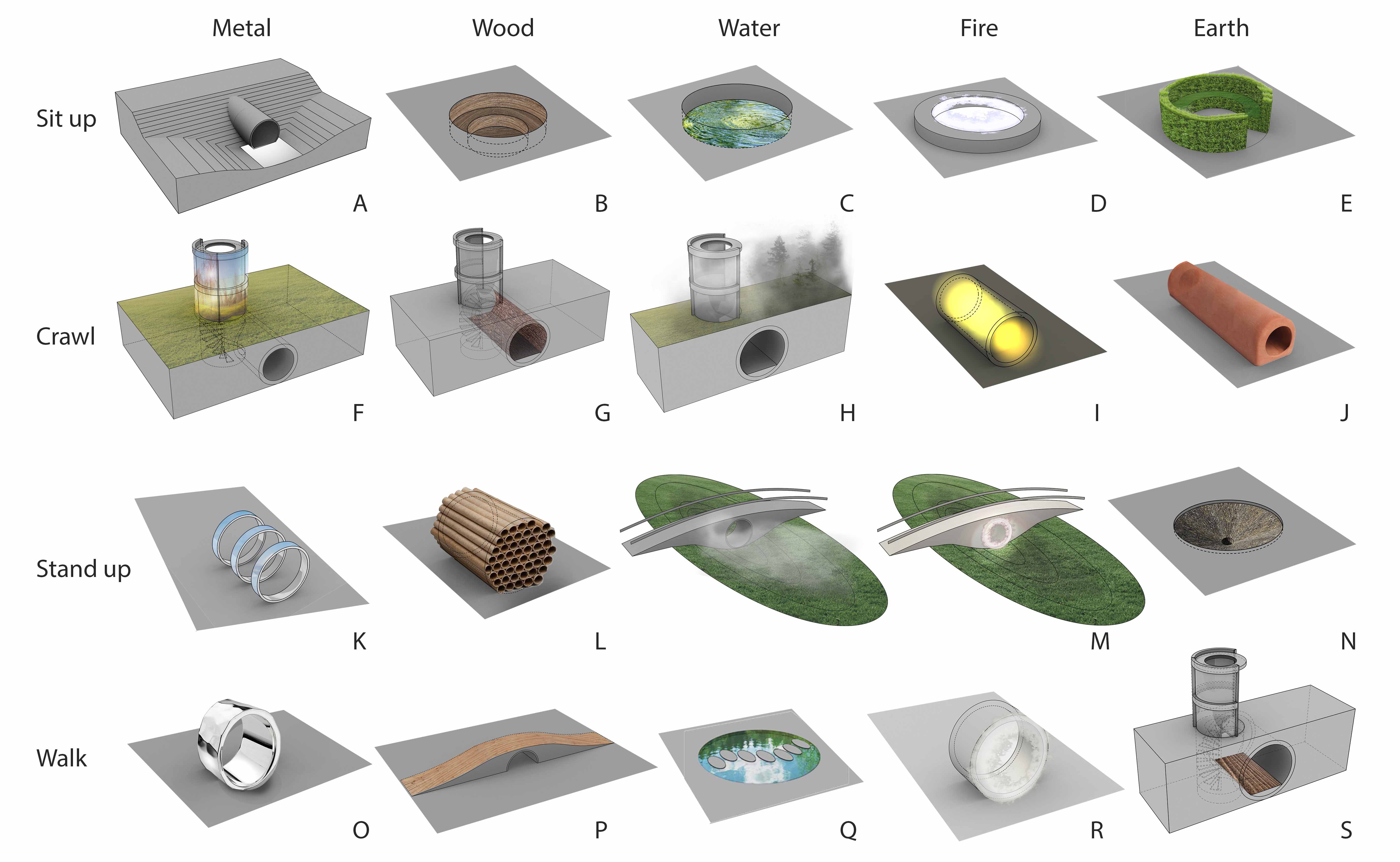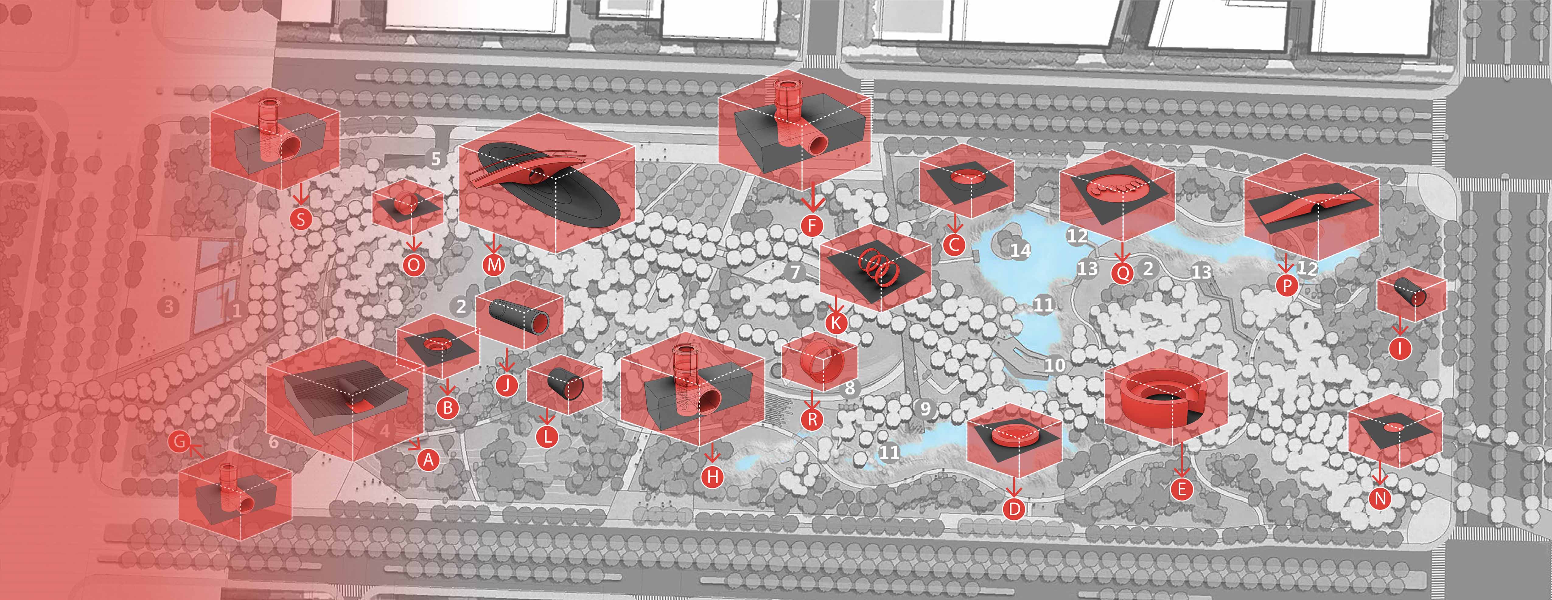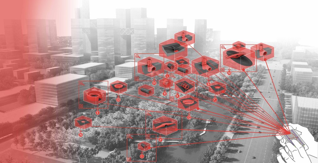 Scenic Orifice, a series of landscape structure which possess the Chinese culture and history of Suqian will mark the heart of the Shanshui Green Corridor, create playful and sustainable spaces that present new forms of urban landscape in the digital age. Using the tubes as prototypes, the structures are designed with the theme of human evolving history (sit, crawl, stand, and walk) and the five phases of Chinese philosophy (metal, wood, water, fire, earth). Together, they create twenty structures, each provides different experience for the visitors. These structures will serve as delicate and playful exhibition places invite artists to design site specific projects. Incorporating the technique of augmented reality and virtual reality, the structures will become platforms which connect historic and cultural contexts and define the park as a new urban icon.